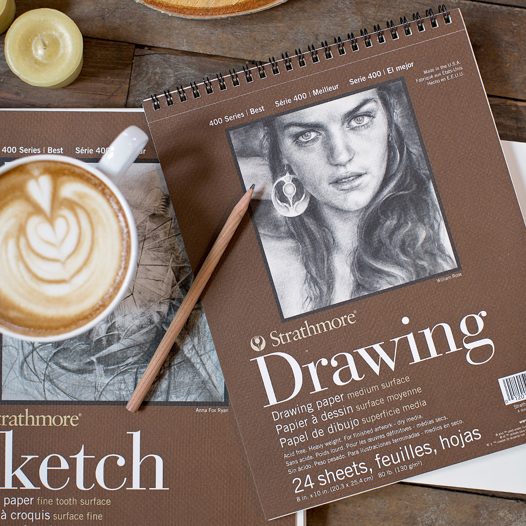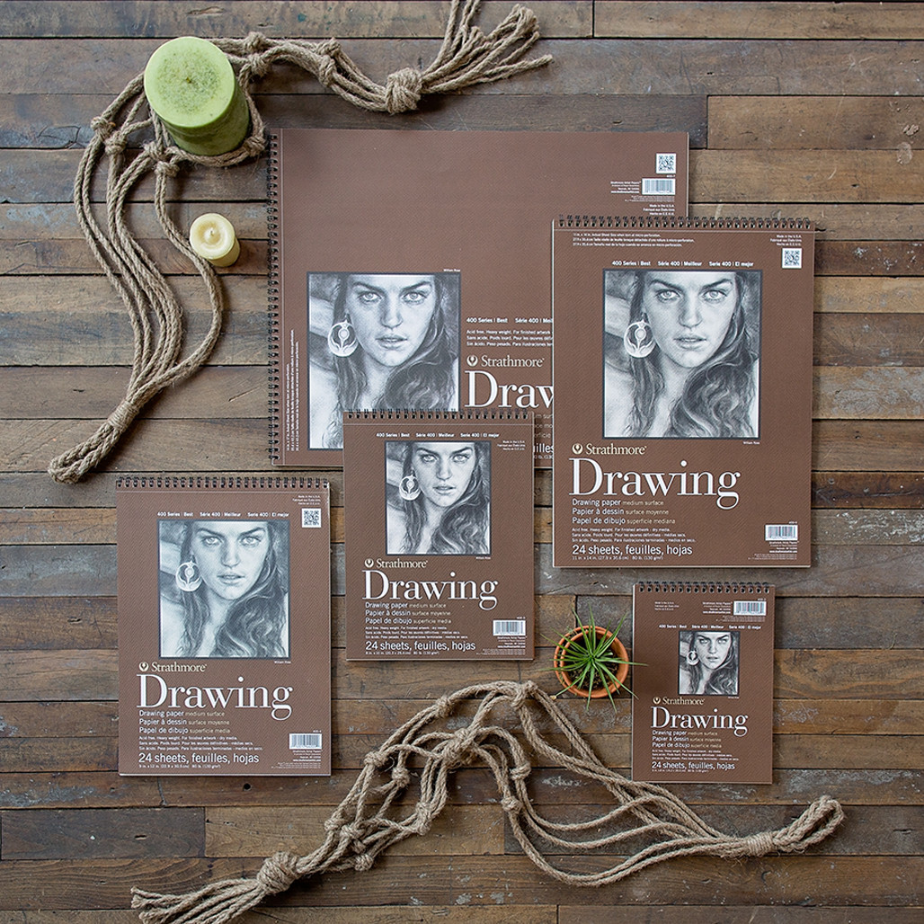 Strathmore 400 Series Drawing Pads are one of the most versatile sheets Strathmore offers. This cream colored drawing paper is ideal for sketching and most finished work using graphite pencil, colored pencil, charcoal, pen and ink, marker, soft pastel, mixed media, and oil pastel.