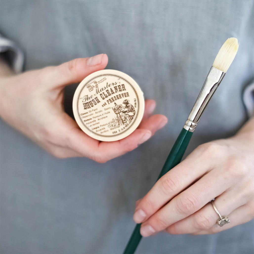 The Masters Brush Cleaner & Preserver removes oils, acrylics, watercolors, stains, and varnishes and helps prevent paint build-up in the ferrule. It also prevents the hardening and build-up so common with today's acrylic paints. It works beautifully on the finest sable and bristle brushes, and makes painting with nylon and synthetic brushes a snap. It conditions the brush to hold more color and helps lay down a smoother more even flow. Use after every session to keep your brushes like new!