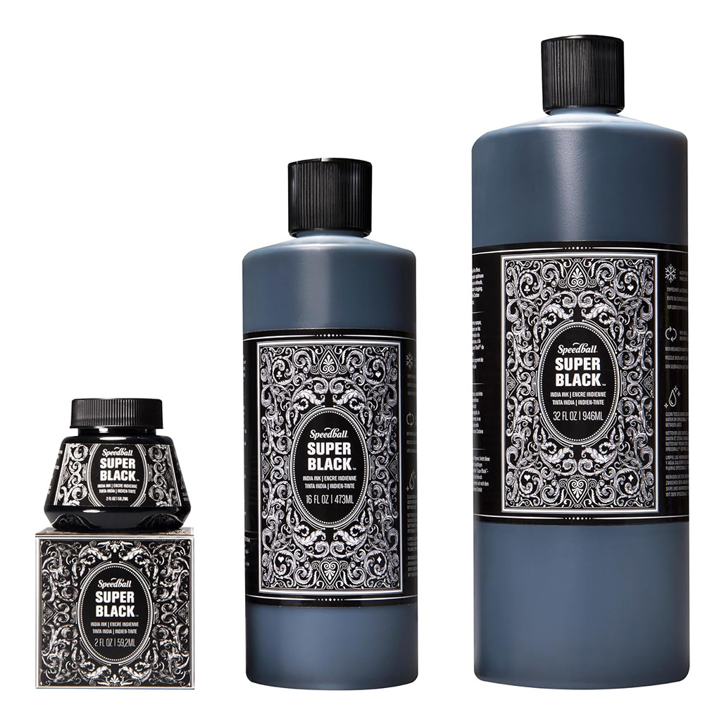 Speedball Super Black India Ink delivers an unmatched permanence, opacity, and optimized fluidity in a verified vegan formulation. It's made from highly opaque, carbon black pigment, hence the name "super black".