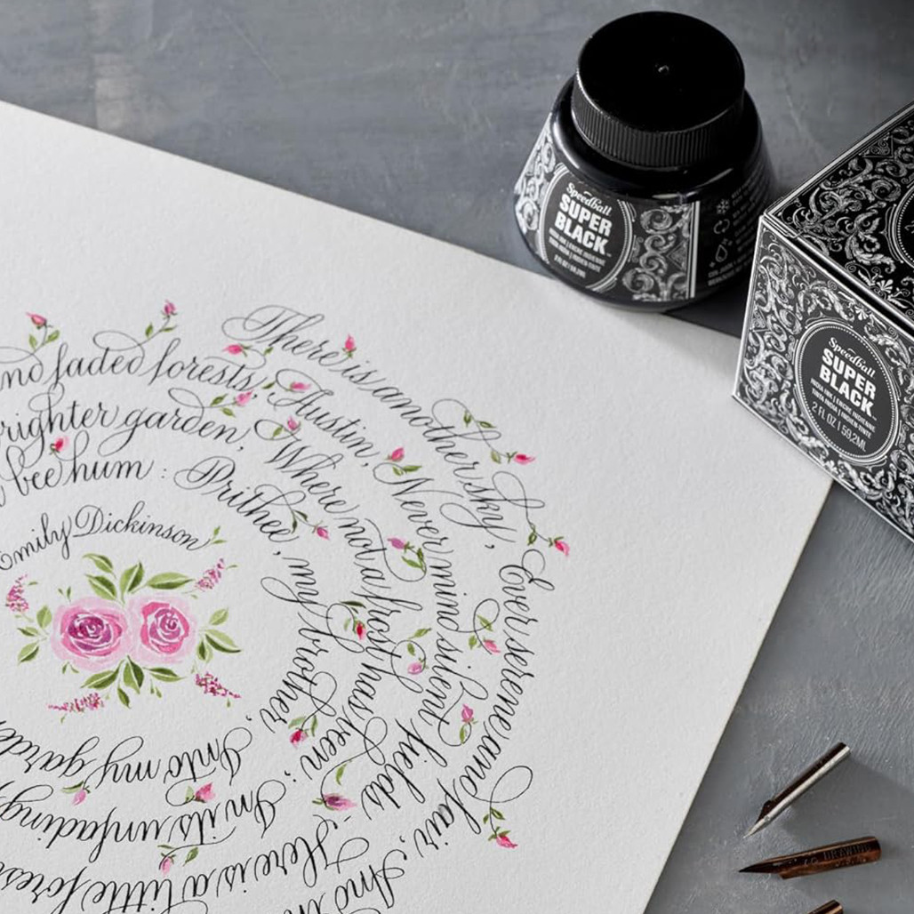 Easily applied by dip pen, technical drawing pens, brush, steel brush, or airbrush, Speedball Super Black is free-flowing, non-clogging, and waterproof once dry. It is ideal for calligraphy, lettering, illustration, journaling, and watercolor techniques.