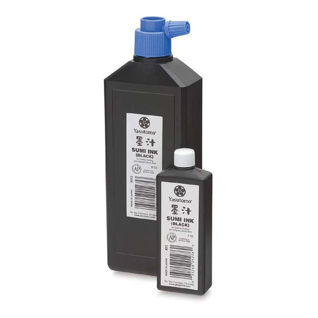 Some sumi-e artists grind their ink from a stick. Others prefer to dribble the ink from a bottle. Yasutomo KY series ink is a bottle of AP certified Non-Toxic black ink made from the same vegetable oil soot as the sticks are. Amply black for coverage.