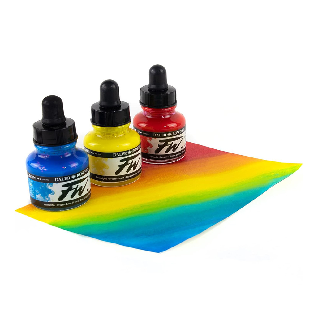 Daler-Rowney FW Acrylic Inks are intensely pigmented, acrylic-based, water-resistant inks with a high degree of lightfastness and intermixability. FW Acrylic Inks can be used straight out of the dropper or diluted to achieve the most subtle of tones, very similar in character to watercolor. Such washes will dry to a water-resistant film on virtually all surfaces and successive layers of color can be laid over.