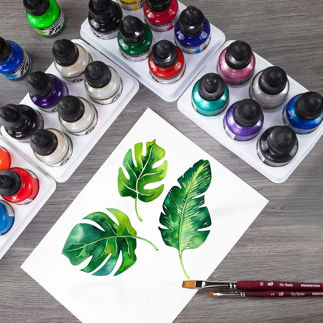 FW Acrylic Inks can be applied using traditional brushes, but also work well through airbrushes, technical pens, and paint markers making them ideal for producing technical illustrations and finely worked drawings. The expressive fluidity of acrylic inks is praised by fine artists, illustrators, graphic designers, calligraphers, decorative artists, and hobbyists.