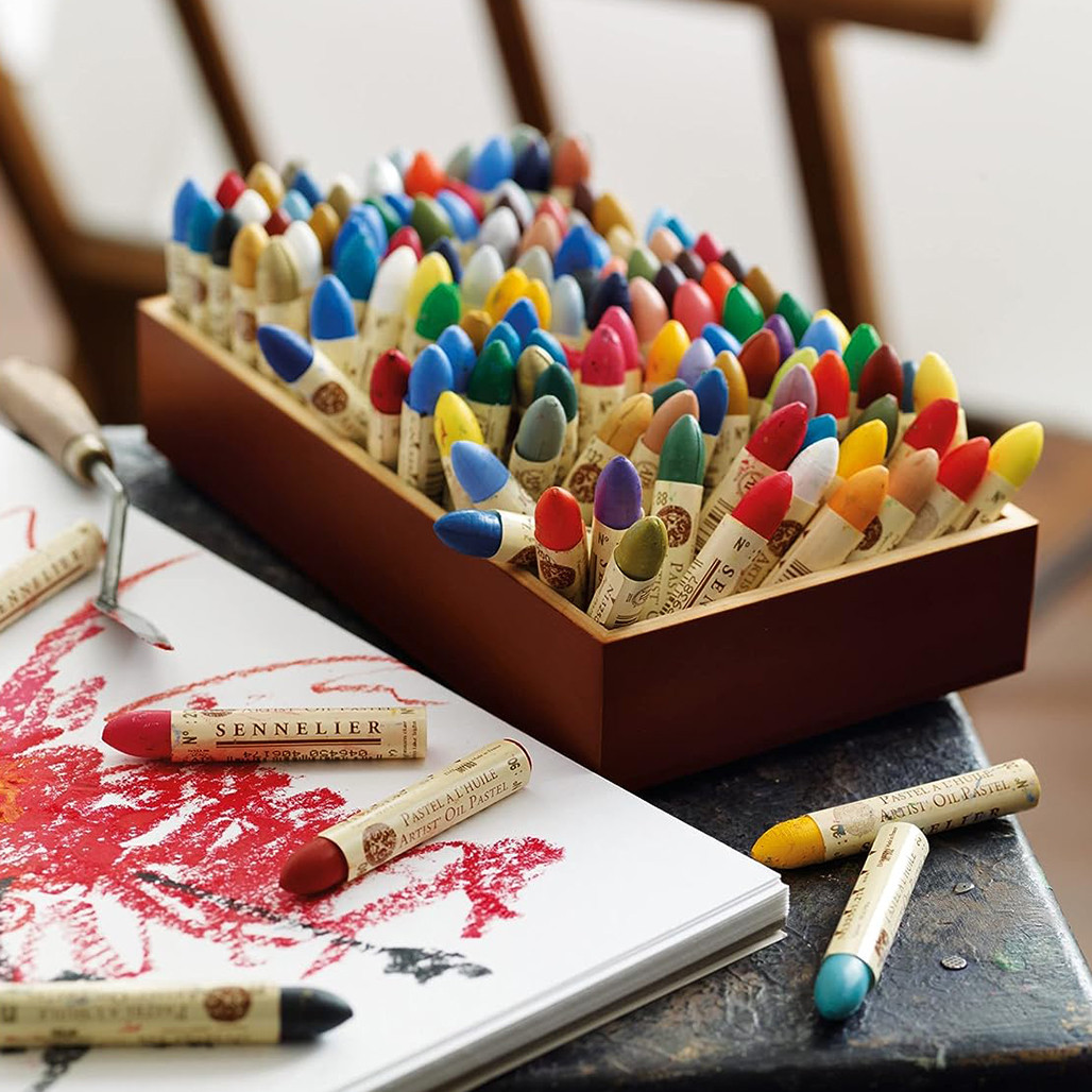 Created in the 1940's in collaboration with Pablo Picasso these creamy, lipstick-like Sennelier Oil Pastels are rich in pigment, cover well, and have outstanding opacity and lightfastness. They are made with top quality pigments, an extremely pure synthetic binding medium and mineral wax. The pigments are ground with an inert, non-siccative binding medium that does not oxidize, ensuring stability of film and surface. The balance of this mix results in a creamy texture that invites broad strokes and freedom of expression. The high pigment content results in high coloring and covering potential and excellent brightness.