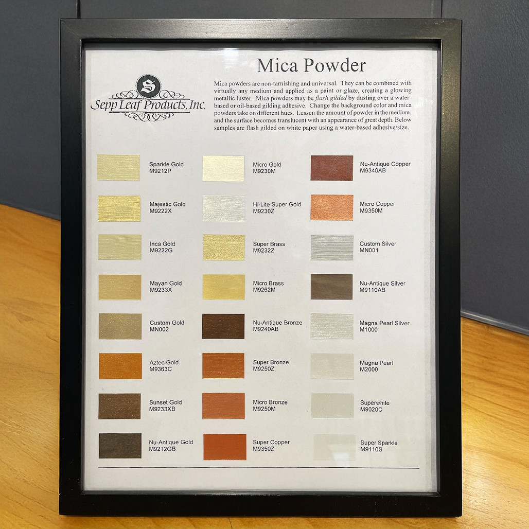 Sepp Leaf Mica Powders are ultrafine particles coated with titanium dioxide and/or iron oxide. Mica powders can be mixed into varnishes, shellacs, acrylics for painting and glazing, kneaded into clays, or dusted onto an adhesive coated surface (a technique sometimes known as "flash gilding").