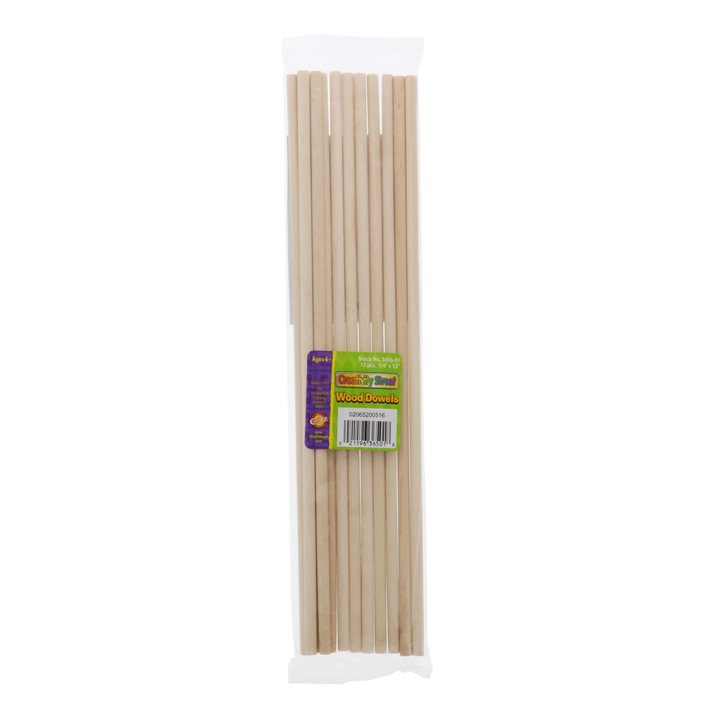 Each dowel measures 1/4" in diameter and 12" long. Available in a pack of 12 dowels.